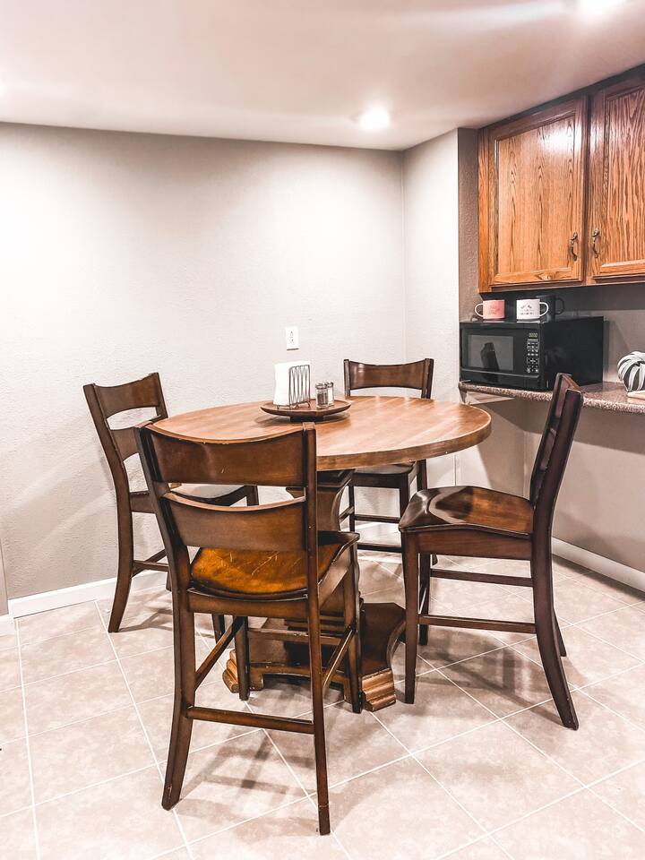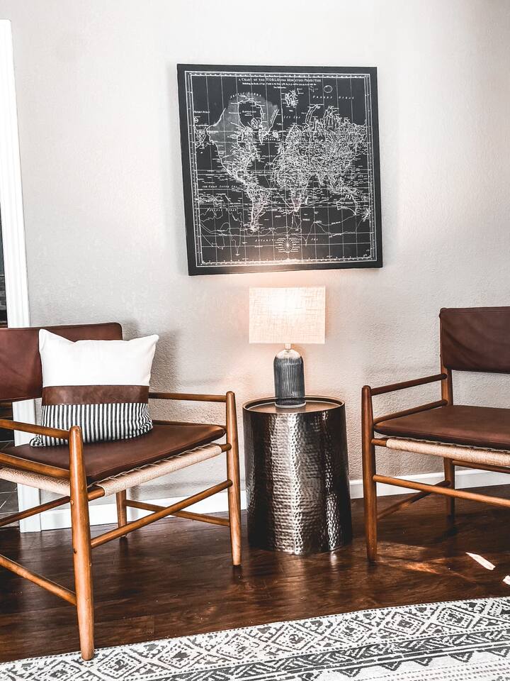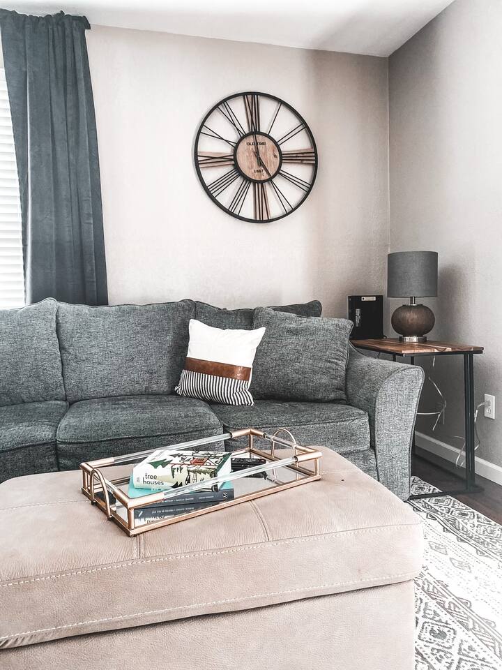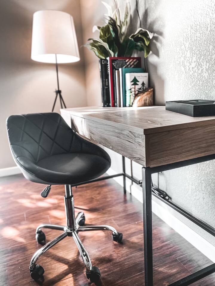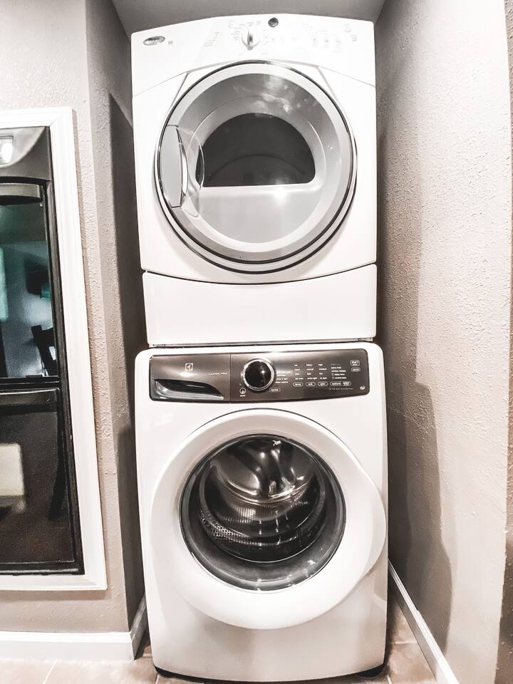 The space is a 1 bed / 1 bath unit in a 4-plex building. Another AirBnB is next door and another in the second floor unit above. There is one bedroom with a Queen bed, closet, and chair. The kitchen is full-sized with all appliances and a coffee bar. There is even a full-size washer/dryer available. The living room has a 55" Roku Smart TV with Netflix available, a desk/chair for work or study, and a couch that pulls out into a Full size bed.