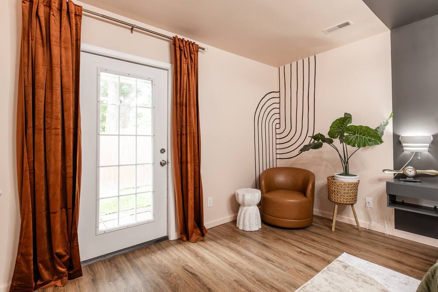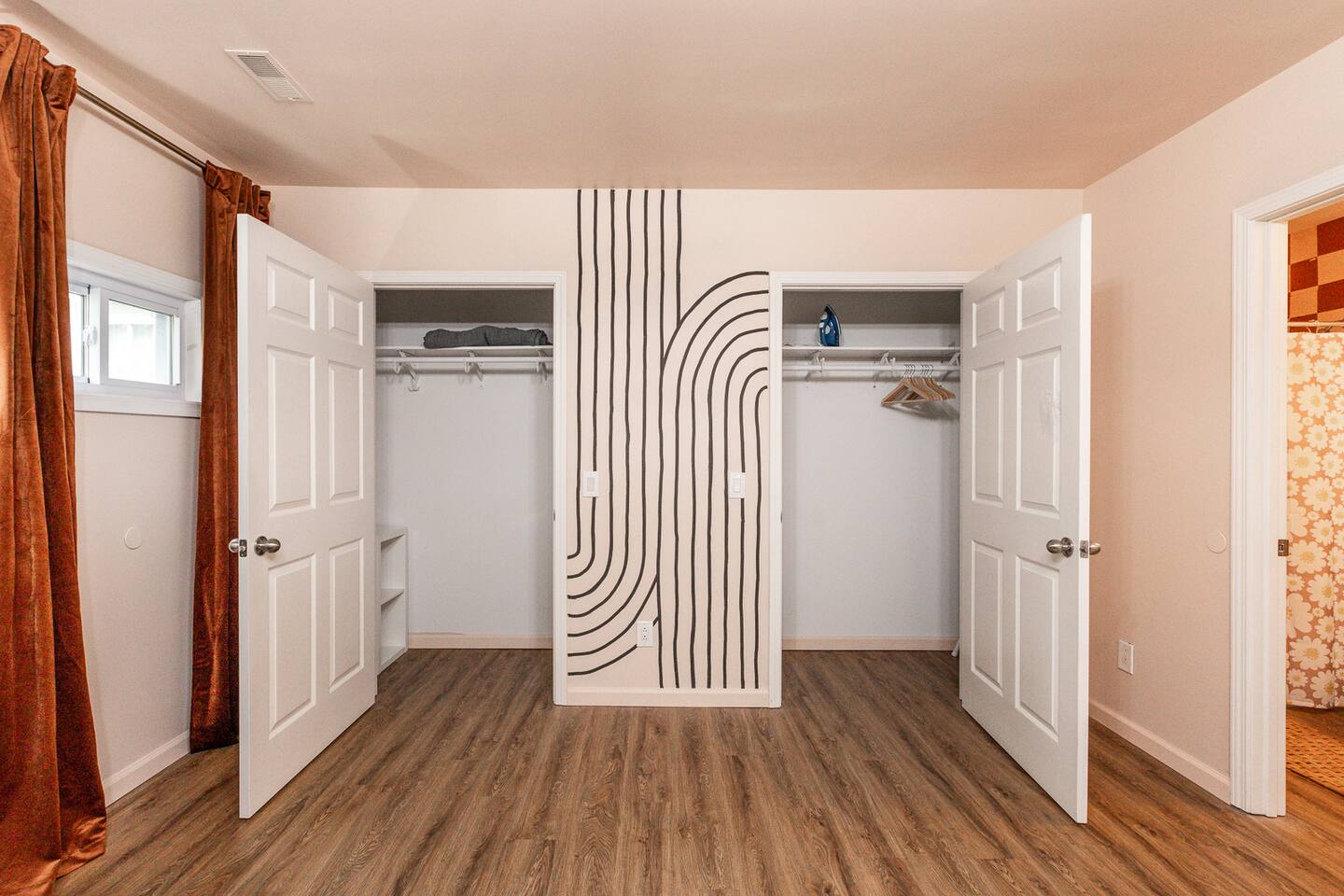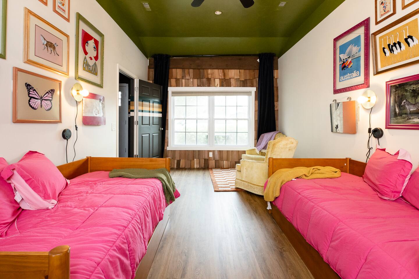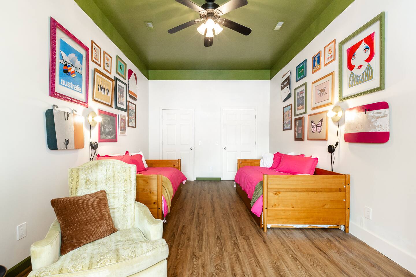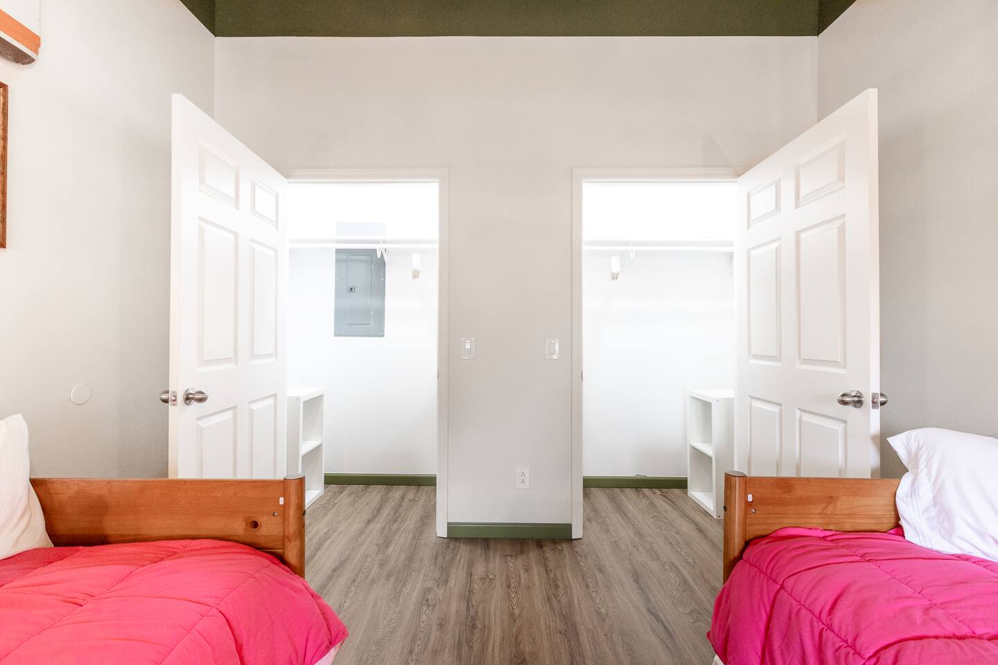The PanAm Flat is a 2 bd/2 ba brick house that has a Tri-plex building attached at one wall. So, we're calling it an apartment, but it is really a house with a 3-unit apartment attached next door. There are 2 large bedrooms. 1 bedroom has its own bathroom inside. The 2nd bathroom is in the hallway between the bedrooms.