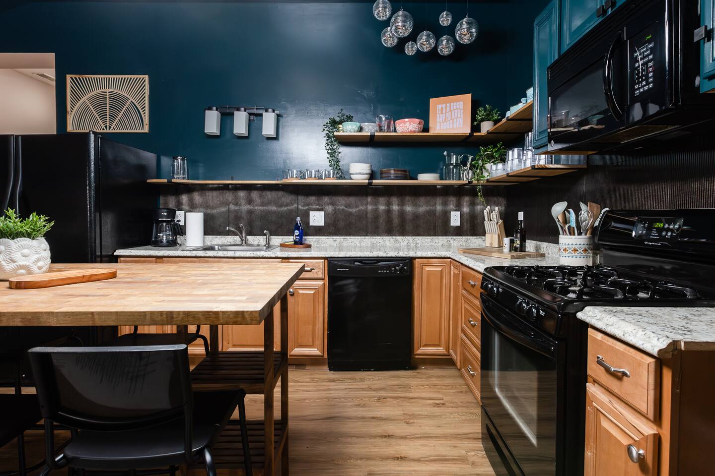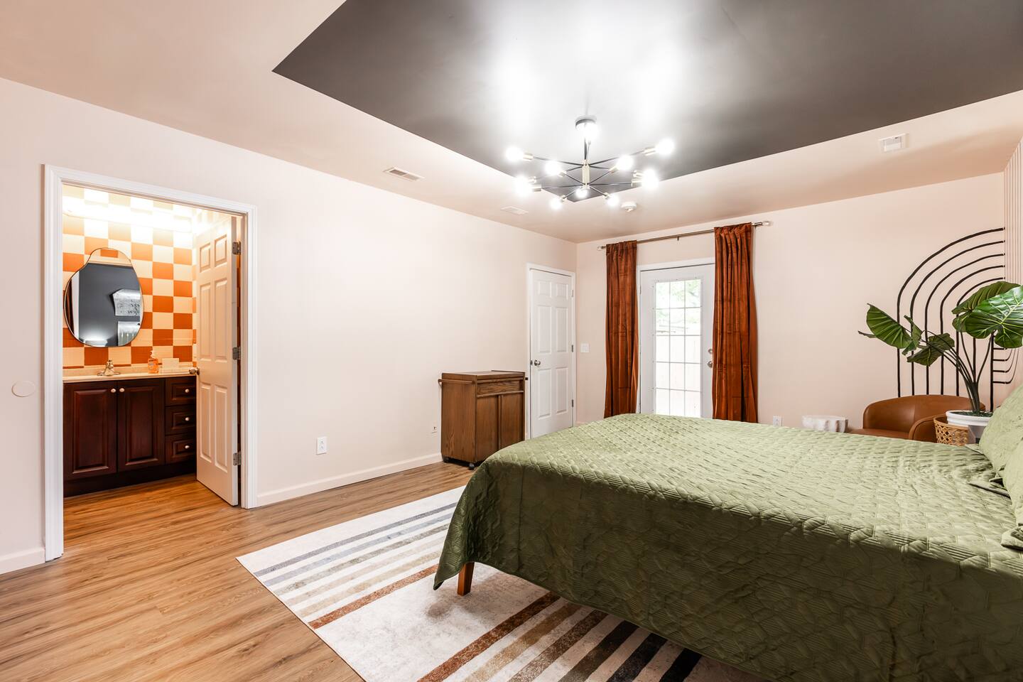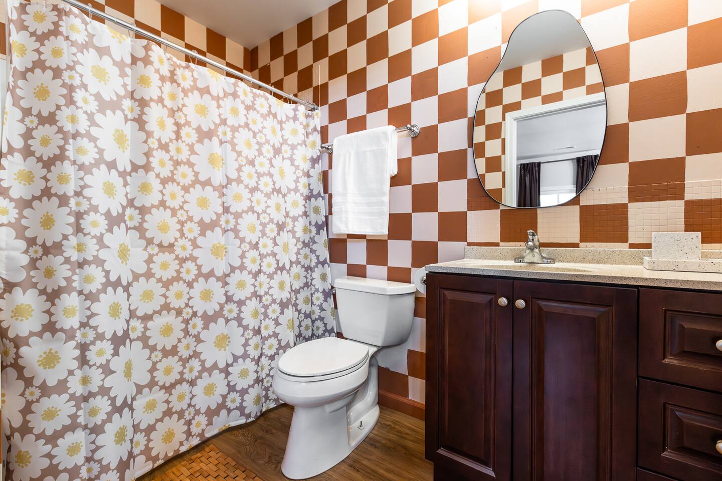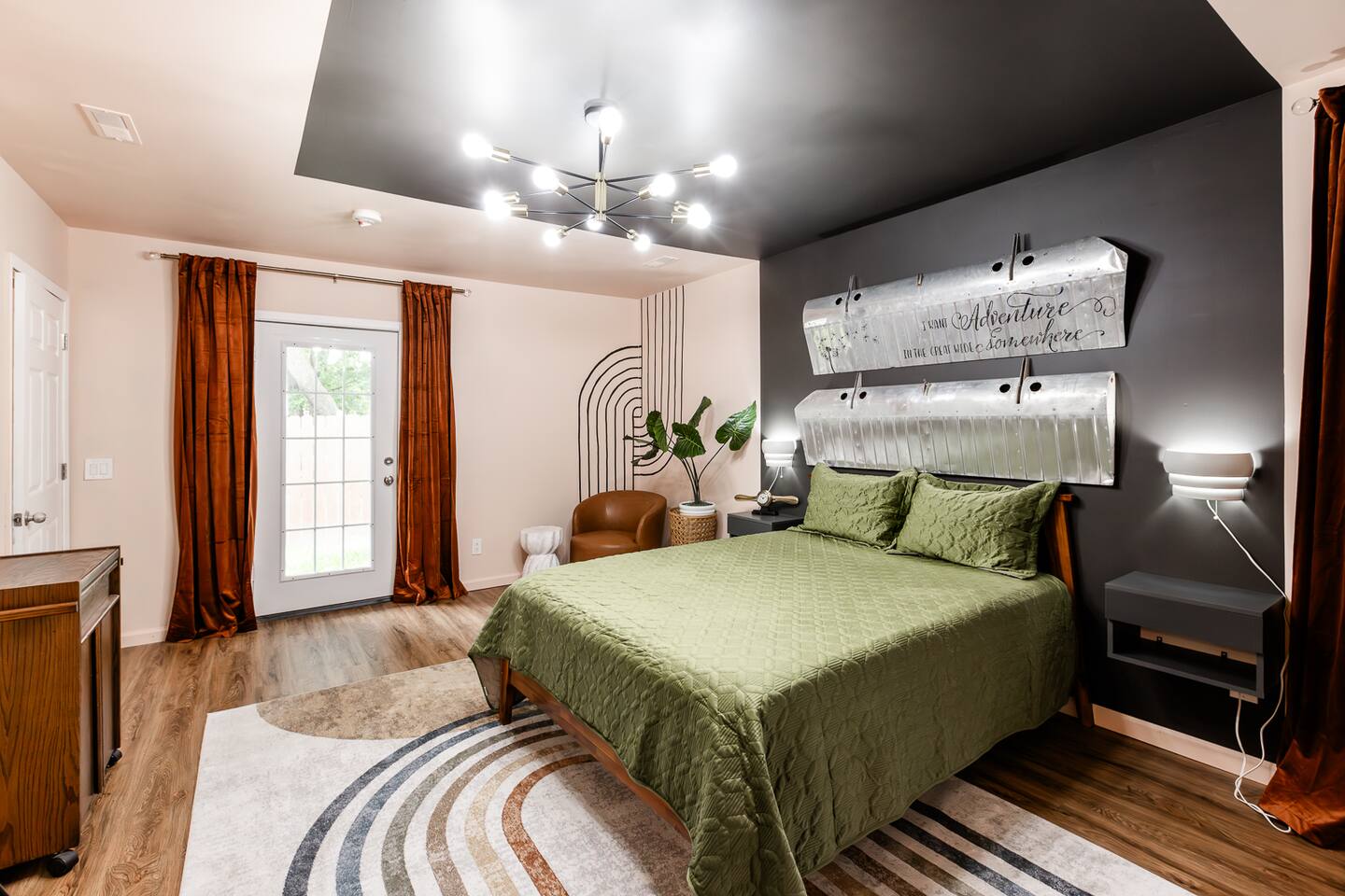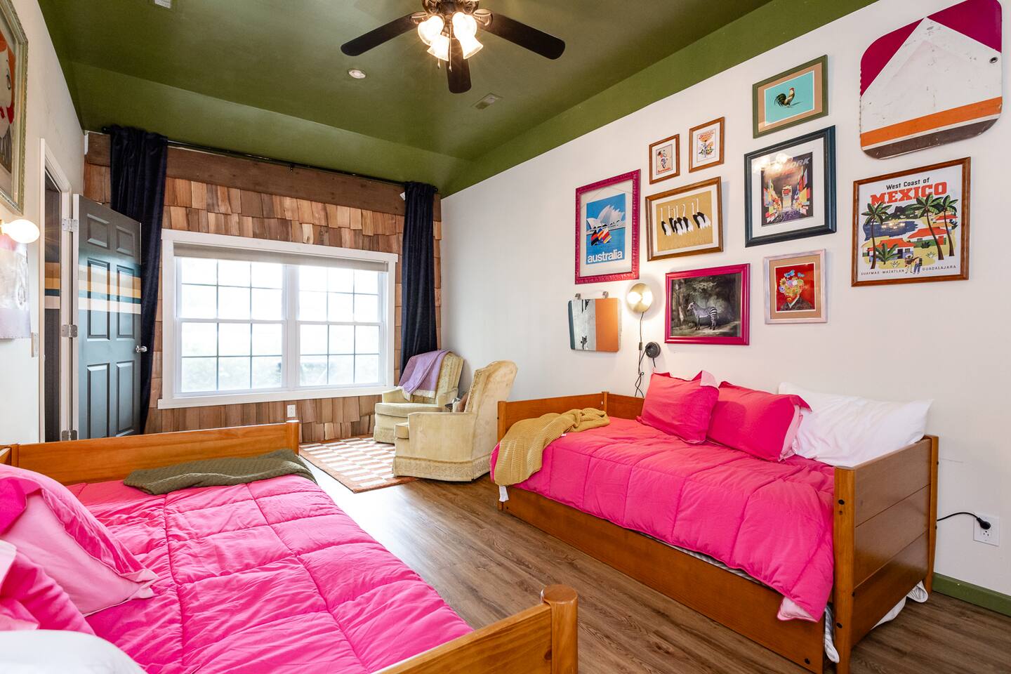 The PanAm Flat is a 2 bd/2 ba brick house that has a Tri-plex building attached at one wall. So, we're calling it an apartment, but it is really a house with a 3-unit apartment attached next door. There are 2 large bedrooms. 1 bedroom has its own bathroom inside. The 2nd bathroom is in the hallway between the bedrooms.